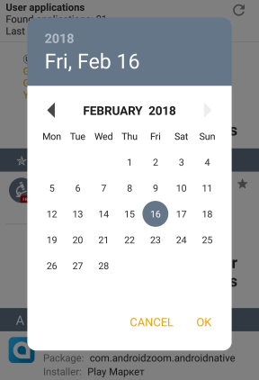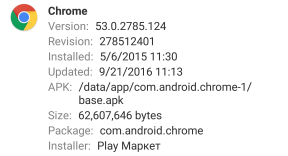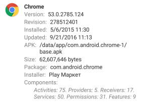 In the header of list exist general statistical information on the number of detected applications and last update date. Each item in the list represents the various properties of the detected application, such as application name, version, package name, size and location of the APK file, installation date and the last update, the number of employed components (activities, receivers, and so on. d.) and others. Selection of type of output information is available from pop-up menu of the page.