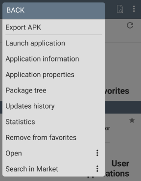 By simply clicking on the application element, user can switch to the view APK file of the selected application, and perform additional operations available with the application of a list item context menu.