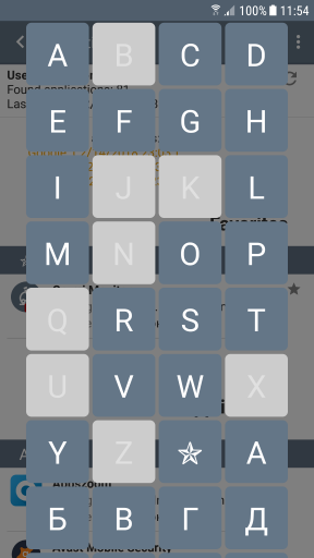 The list item of group's name allows you to open by click alphabetical index of names of applications present in the list. In the case of the primary language, application uses the full alphabet, while for the other languages only those symbols that are found.