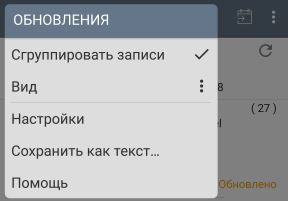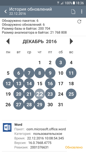 |  Предоставляемый пользователю список обновлений сортируется по времени и может быть сгруппирован по именам пакетов. Каждая запись списка включает в себя следующую информацию: имя пакета приложения, время события, а также название и версию приложения, если они были определены.  | Данный модуль содержит данные об установке, удалении и обновлении обнаруженных на устройстве приложений. Запись данных производится в фоновом режиме и не требует необходимости его запуска. При первом запуске модуль сканирует устройство на предмет обнаружения приложений и фиксирует время их установки и обновления. Таким образом для установленного приложения всегда будет хотя бы одна запись (дата установки). Данные о промежуточных обновлениях приложений в период с их установки до первого запуска модуля, к сожалению, будут недоступны, так как информация формируется на момент первого запуска.  При необходимости пользователь может удалить отдельную запись списка, либо все записи выбранного приложения. В последнем случае актуальными останутся только записи об установке и последнего обновления выбранного приложения, вся промежуточная история станет недоступна. Заголовок списка предоставляет информацию о количестве обнаруженных пакетов, количестве записей обновлений, а также размер базы данных модуля. При необходимости пользователь может упаковать базу данных для уменьшения ее размера, при этом все записи об удаленных пакетах станут недоступны. Также возможна приостановка работы модуля (отключение в настройках), при этом все записи об обновлениях в период отключения будут недоступны. Для определения различий версий приложений модуль использует компонент АНАЛИЗАТОРА ОБНОВЛЕНИЙ, работающий также в фоновом режиме.