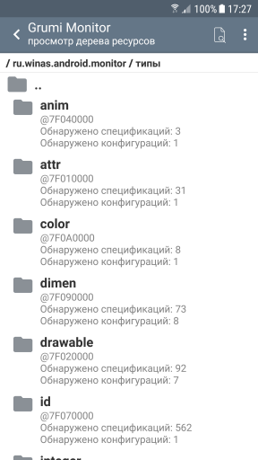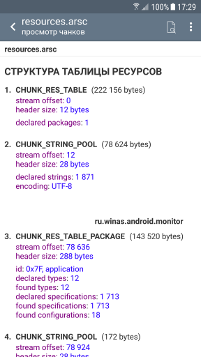 ![]() Просмотр значений спецификаций ресурсов позволяет получить быстрый доступ к ссылочным ресурсам, что дает возможность определить их составляющие. Описание ресурсов приложения Андроида хранится в таблице ресурсов в файле resources.arsc, который имеет сжатую структуру в виде фрагментов, именуемые чанками. При необходимости, при выборе соответствующей команды меню, возможен просмотр таблицы ресурсов в виде чанков, механизм которого описан ниже. | По умолчанию ресурсы выбранного приложения представляются в виде дерева, элементы которого группируются по пакетам, включенным в таблицу ресурсов, типам ресурсов и их конфигурациям. Подобная группировка позволяет оперативно определять используемые в приложении типы ресурсов, а также выявлять зависимые от конфигурации устройства отдельные спецификации ресурсов. ![]() |