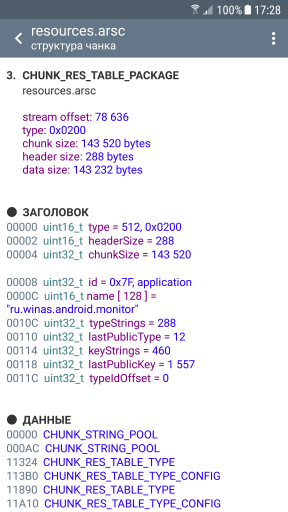 ![]() Внутренний механизм модуля просмотра данных позволяет просматривать структуру чанков и декодировать ее "на лету", определяя ресурсы и конфигурации. При этом в случае "неожиданных" результатов возможен вывод предупреждений. Данные предупреждения не носят характер ошибки, в большинстве случаев обращать на них внимание не надо, но они помогают оценивать вероятность возможных будущих неприятностей. | Описываемый механизм относится ко всем подобным файлам, чья структура состоит из чанков. Каждый чанк имеет свой тип, значение которого зарезервировано в SDK и хранит информацию о ресурсах, включая их тип и значение в зависимости от конфигурации устройства и прочее. ![]() |